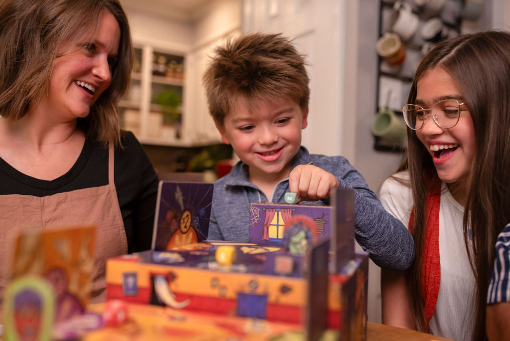 Each turn in Boxtop Pinball: Haunted House, you flick one of your dice from the launch pad into the cardboard pinball machine to earn points. For each die that remains on the machine at the end of the round, you score the number of points indicated on that die, plus additional points for various bonuses. Earn points by hitting monsters, gathering clue tokens, and staying in haunted realms. Whoever scores the most points after three rounds wins!