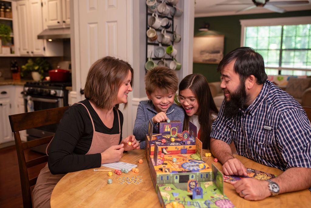 Each turn in Boxtop Pinball: Haunted House, you flick one of your dice from the launch pad into the cardboard pinball machine to earn points. For each die that remains on the machine at the end of the round, you score the number of points indicated on that die, plus additional points for various bonuses. Earn points by hitting monsters, gathering clue tokens, and staying in haunted realms. Whoever scores the most points after three rounds wins!