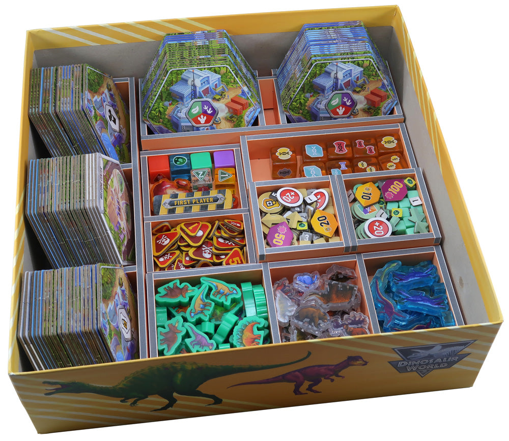 This is a game that engages my mind from the initial draft of building and paddock tiles and holds it captive and constantly planning until the very last Jeeple Tour is finished and final scoring begins. There is a lot to initially take in with this one, it sprawls across the table like the fully extended wings of a Pteranodon, it can seem intimidating and dangerous as rules are explained and you find out that deaths in your park will result in negative victory points at the end. The “danger dice” are exactly as advertised and have a heavy lean towards causing havoc in your park as you take your paying visitors on tours through rows of caged dinos, you’ll have to find balance between security measures and how many massive creatures you let your scientists create. So much to do in so little time, and even the best laid plans will have to drastically shift each turn as the decisions made by your opponents will directly influence your access to certain types of workers, the tiles used to build a successful park, or the vital DNA you’ll need to create magnificent creatures to shock and amaze your visitors.Let me offer my a tip for the massive sprawling bit, it looks amazing all laid out on the table, there are hefty and translucent amber dice, a plethora of these awesome dinosaur tokens to gather as you create dinosaurs, thick dual layer boards with exciting colors and easily referenced iconography to track your DNA storage, security, threat, and Jeep upgrades and several other boards to hold tiles and score tokens. At four players you have a full table of “OMG look at all the awesome stuff” laid before you, save a bit of table room though and pull the island board that contains the set of attractions for each player. After our first few games we found it much easier to give each player their own supply of those unique attractions or keep them off the table in the box, one game is enough to familiarize yourself with the public actions and just say on your turn that you’re building the restaurant, security building, roller coaster, or merchandise shop. Now you’ve got a bit of breathing room with one of the main island boards off the table and you can focus more on remains. It is still a lot, but all the pieces smoothly fall into place with an easy to navigate rulebook and iconography that accurately explains board and tile actions with quick glances.This has been a surprising survivor in our collection as it took a few games to get past the obvious strategies and start focusing more on how certain tile combinations work together and how not to be afraid of negative points for visitor deaths. We rushed the first few games trying all herbivores if we could, and then full on carnivores and only focusing on security and make more large dinos, in later games we started seeing more value in upgrading the Jeeple garage and trying to maximize excitement levels even at the risk of unfortunate security accidents in our parks. Dinosaur World is the type of game you can get lost in with the different ways you can approach it. Is an all massive carnivore/high security strategy still a good one, yes it is, it works nicely actually, but you can fall to someone who’s built a lager park of more tiles and fully upgraded their Jeeple garage to make their tours longer, more exciting and constantly unlocking powerful upgrade and bonuses at the end of each round. You still have to be on guard for the player who aims for the high point scoring objective cards and focuses on getting first place points on each of those while having a smaller less exciting park, but a few optimized buildings and drafting green workers can let that player gain more than enough income during the private action phase to build several expensive victory point scoring tiles each round.Dinosaur World is everything and the kitchen sink all crammed into one impressive game in the best of ways, it’s one of those cookie recipes that end up having cranberries or something in it that you’d never expect to like but you try it out and WOW, it’s amazing. I love that each phase you’re picking up a new puzzle piece that you have to fit into your park, other players may lock you out of getting the best building or paddock tiles but maybe you’ll gain the advantage by accumulating and banking a lot of excess DNA to use in the future and save more of your workers for private actions. Fully funding the Jeeple Garage and making the most of my tours each round is my current favorite play style, you can make huge gains in all areas of the game from the bonuses you accumulate there along with being fully prepared to make long tours through the park each round. However you decide to approach it, do so with caution Dinosaur World will sink its teeth into you and pull you into an ever evolving and thinky city building dinotastic game.