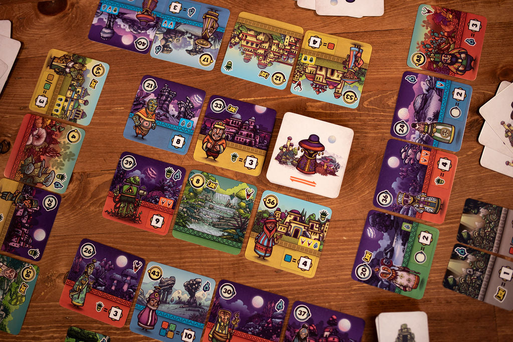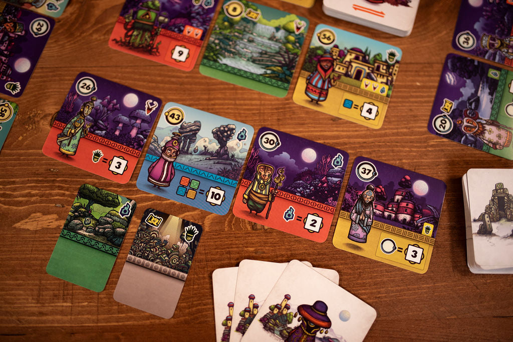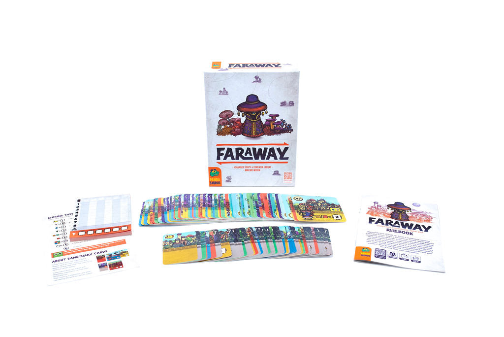 Over the course of the game you will play a row of 8 cards in front of you from left to right. These cards represent the Regions you will come across while exploring the lands. Characters on these cards will grant you Fame if you later fulfill the conditions they demand. However at the end of the game, you walk back the way you just explored, scoring cards in the opposite order you played them. The player with the most Fame after scoring Regions and Sanctuaries wins!