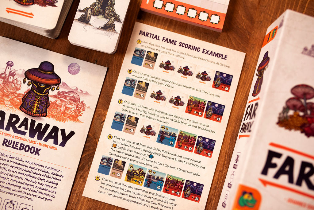 Over the course of the game you will play a row of 8 cards in front of you from left to right. These cards represent the Regions you will come across while exploring the lands. Characters on these cards will grant you Fame if you later fulfill the conditions they demand. However at the end of the game, you walk back the way you just explored, scoring cards in the opposite order you played them. The player with the most Fame after scoring Regions and Sanctuaries wins!