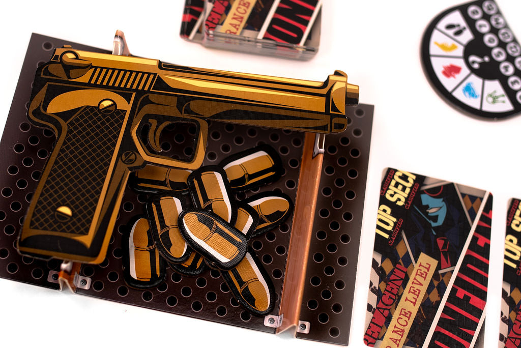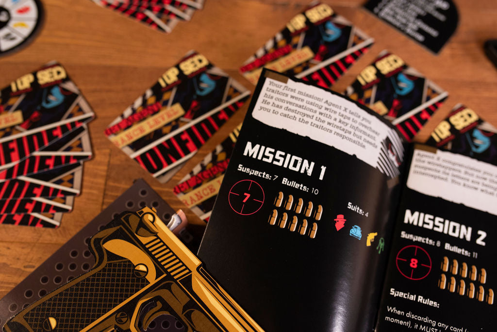 A card matches the Suspect when: it's the same suit as the Suspect, it's the same number as the Suspect, or its number is a multiple or factor of the Suspect's number. If an Agent is ready to guess they may attempt to Eliminate the Traitor, but beware — you have a limited number of bullets each mission!