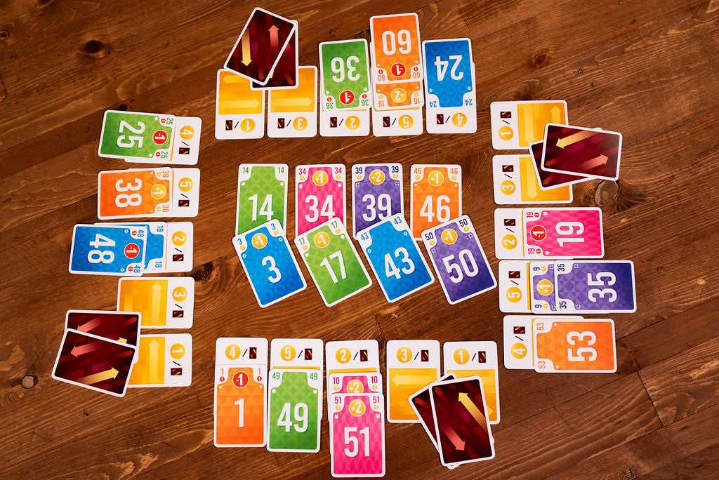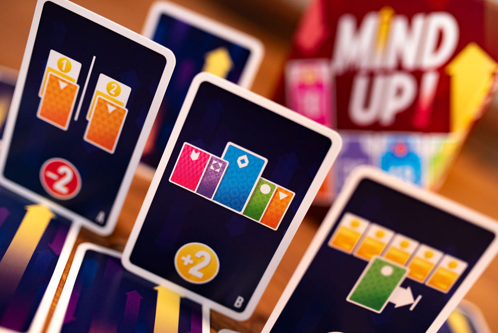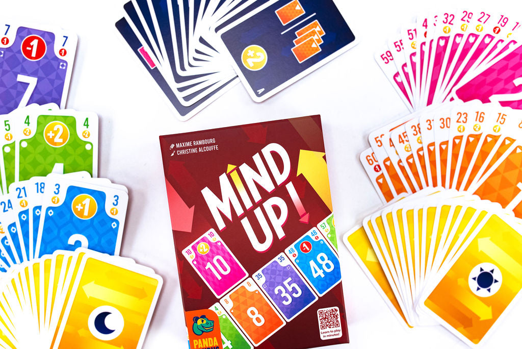 Mind Up! is a clever card game that'll leave you wanting more. You start with a line of cards on the table equal to the number of players. Each player will pick a card from their hand and simultaneously reveal to make a new line right below. Order these cards from lowest to highest value. Players will then take the card directly above the one they just played and add it to their tableau. These cards will score points at the end of the round depending on their color and the order they were picked.
