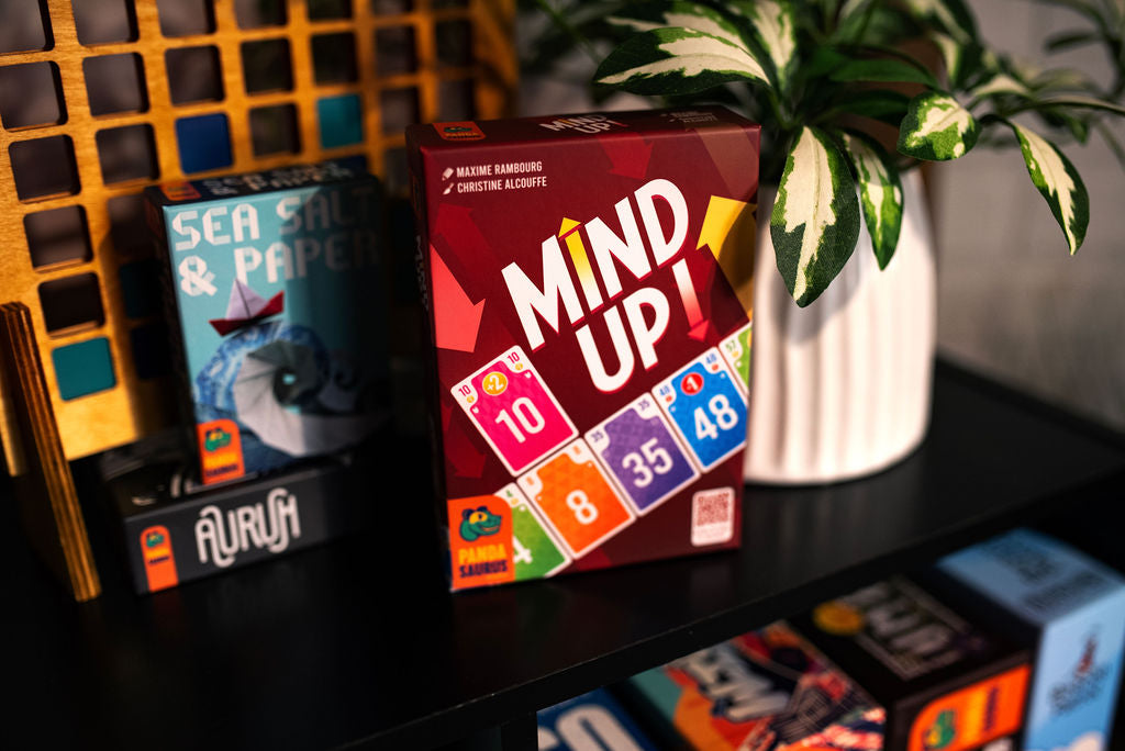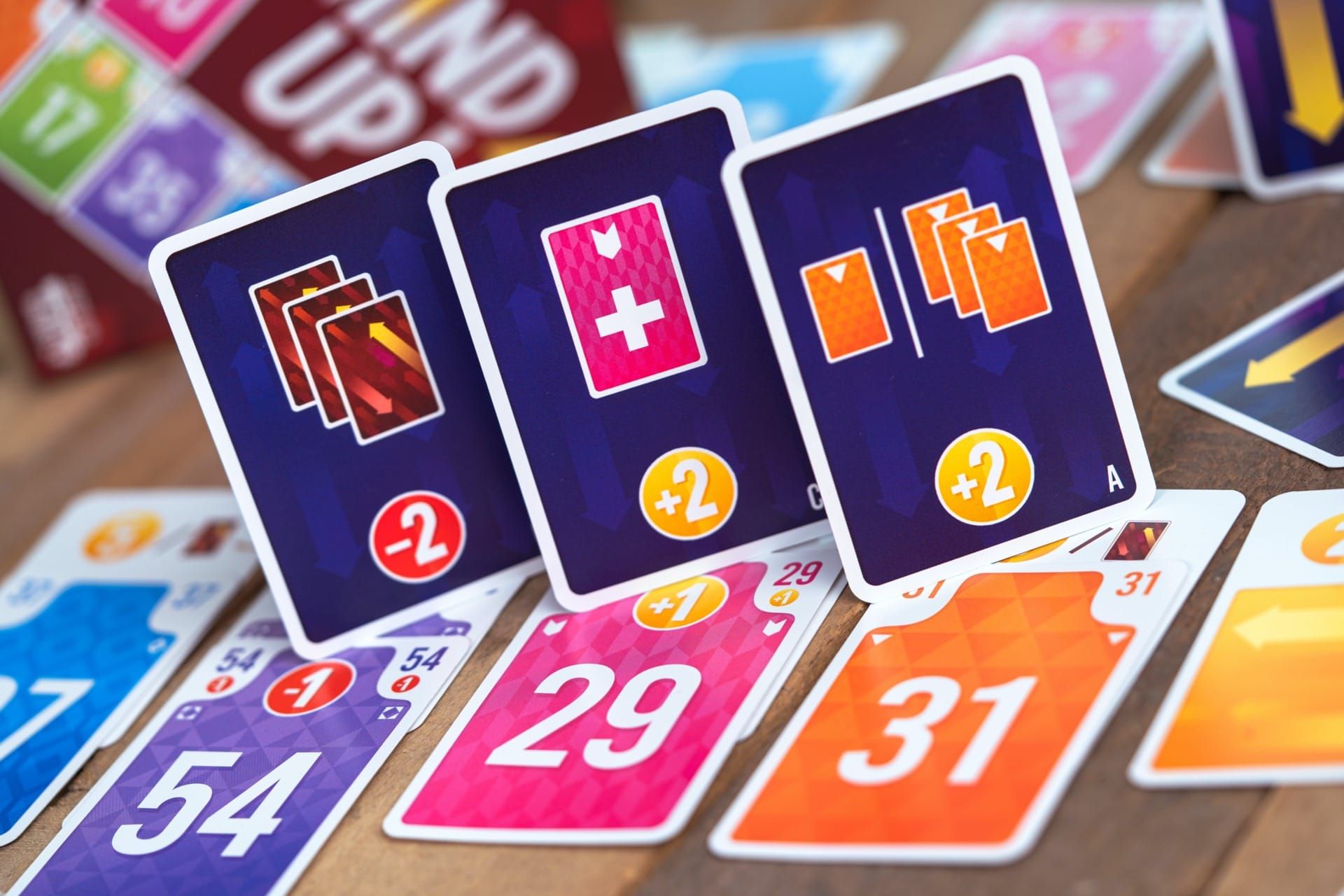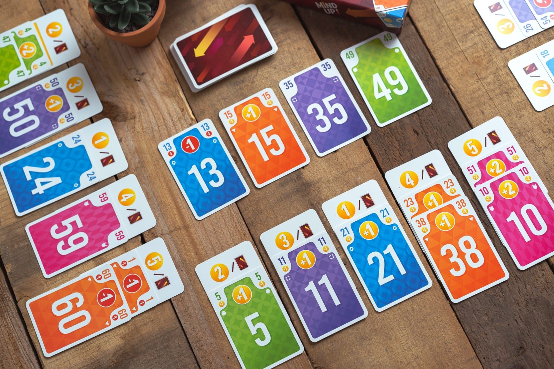 Mind Up! is a clever card game that'll leave you wanting more. You start with a line of cards on the table equal to the number of players. Each player will pick a card from their hand and simultaneously reveal to make a new line right below. Order these cards from lowest to highest value. Players will then take the card directly above the one they just played and add it to their tableau. These cards will score points at the end of the round depending on their color and the order they were picked.