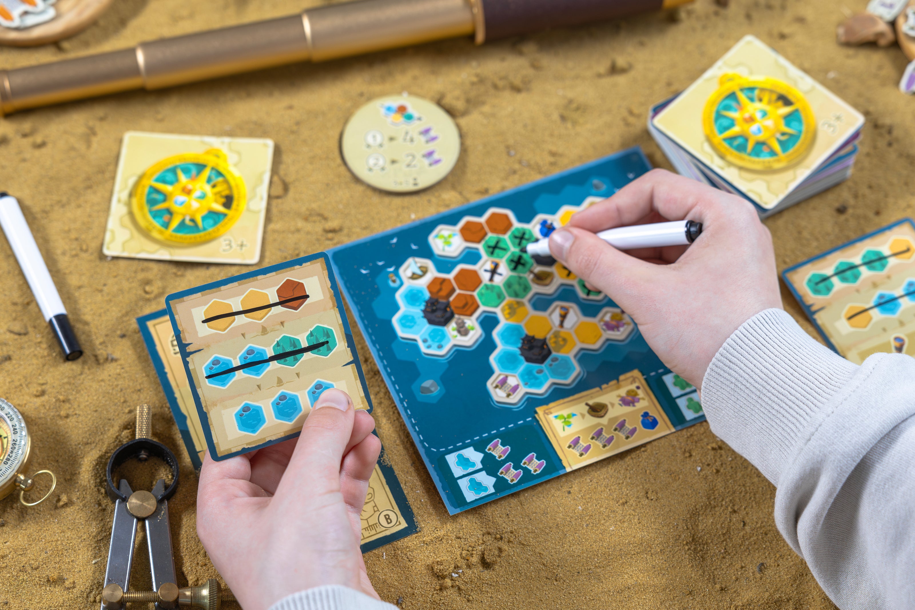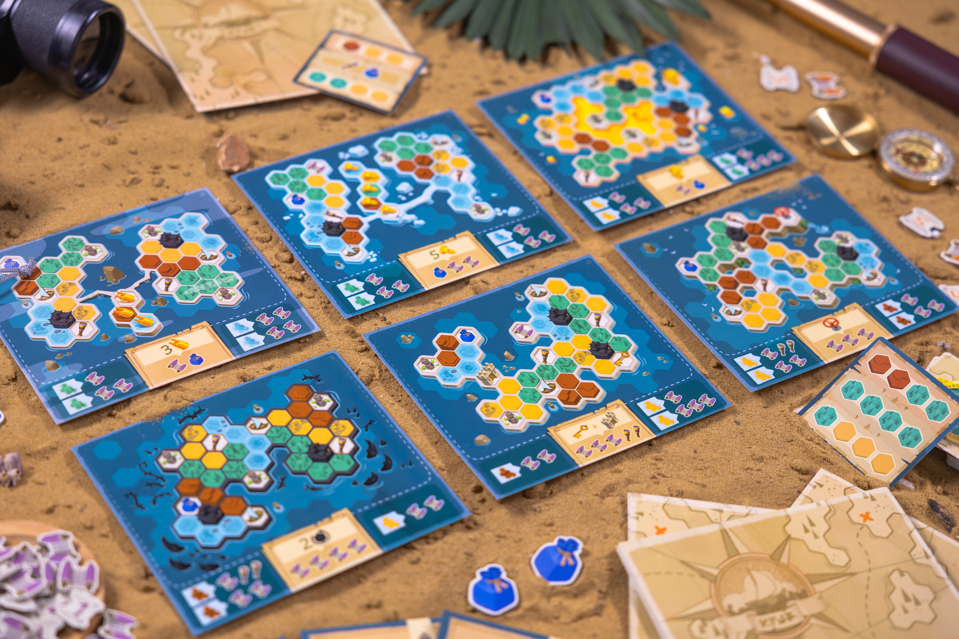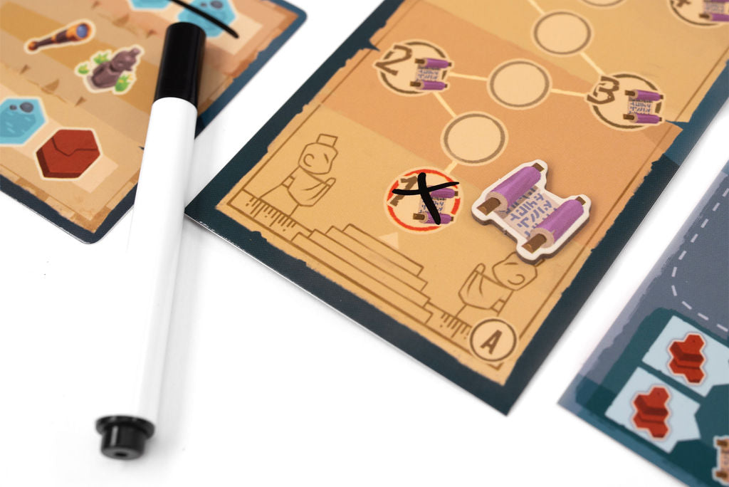 Players starts with their own map of an Island that's divided into several colored areas. Each turn they cross out the available symbols from one of the two cards in their hand, cross out matching fields on their map, then pass the cards along to their neighbor. By exploring certain areas, completing quests on the Island, looting treasures, and progressing on their own Tree of Wisdom, they gather valuable scrolls. If they've exhausted most of their research on their current Island, reaching a boat allows them to move to a new one! Whoever has the most scrolls at the end of the game wins.