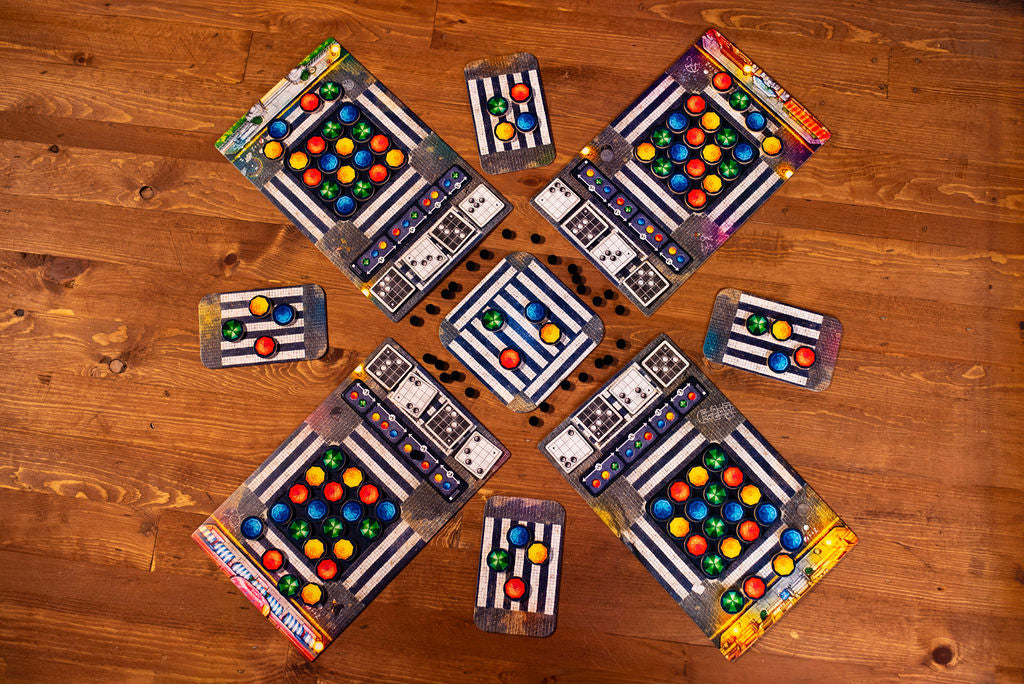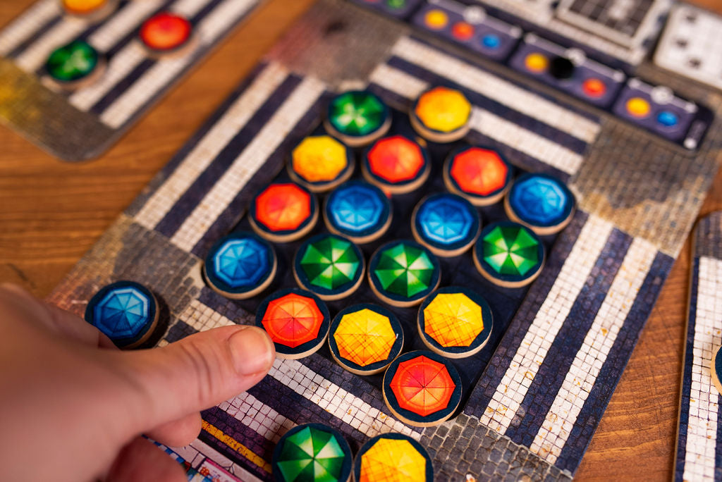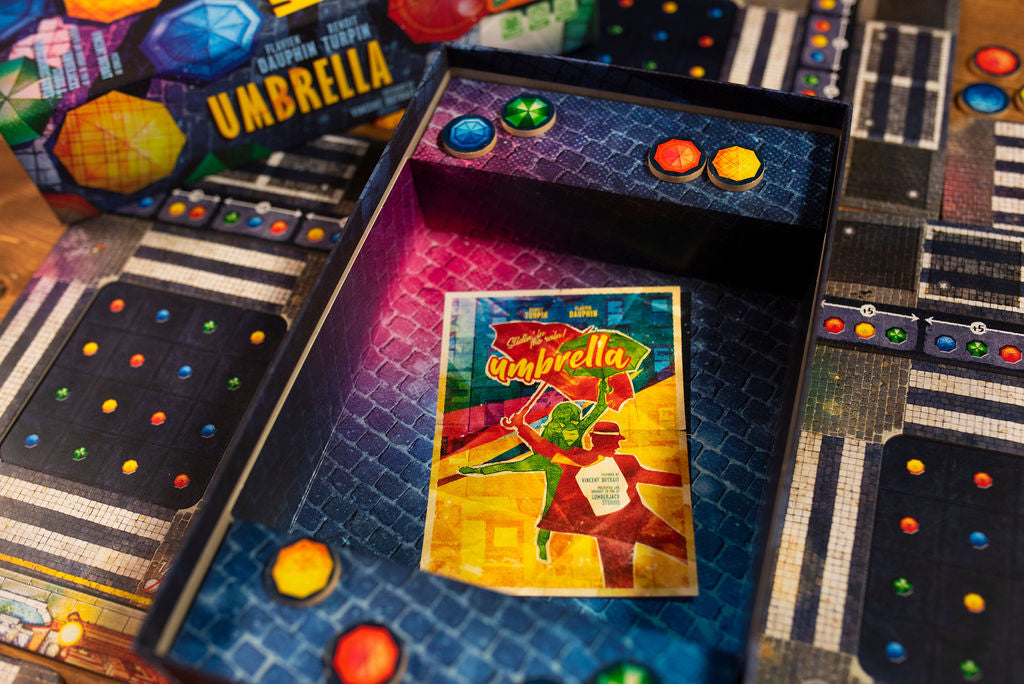 In this abstract strategy game, players aim to complete Figures using 4 Umbrellas of the same color. They slide Umbrellas from Waiting Zones onto their 4x4 grid, consequently sliding Umbrellas off of their Stage. After sliding, if their Stage matches a Figure Tile, they place a token on their scoring board and cover up the color used to complete it. They then pass the completed Figure Tile to the next player. The game end is triggered in 3 different ways, and points are earned through scoring tokens, bonuses, and empty Personal Waiting Zones. The player with the most points wins!